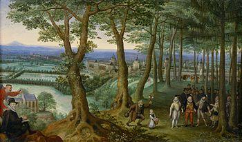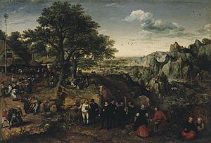 Lucas van Valckenborch also included miniature portraits of himself and his friends in a number of his landscape paintings. This is the case, for instance in The Emperor's walk in the forest where he has depicted himself on the left of the composition with his drawing tools. In the Landscape with a Rural Festival (1577; Hermitage) he included portraits of his friends Abraham Ortelius, Joris Hoefnagel and himself among the throng of revellers.[2]