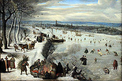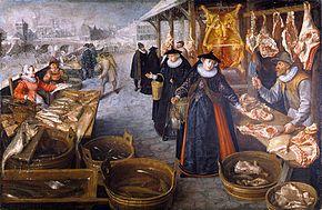 The still lifes in many of the market scenes were the work of his assistant Georg Flegel who may also have trained with him. A snow-covered fish market scene (Royal Museum of Fine Arts Antwerp) is another example of a market scene set in the winter. People are shown skating on the ice in the background. Two muffled-up well-to-do women are making their purchases dressed in the typical Brabant style of around 1580–1600. The fishmonger is shown slicing off pieces of salmon, while his wife is taking smoked fish from a hook. The fish and utensils in the foreground are the work of Flegel who was able to render the fine metal shine of the brass bucket and the grain of the wooden water bucket.[10] Georg Flegel also painted the food and luxurious tableware in two paintings of van Valckenborch depicting banquets (Silesian Museum and St Gilgen-Salzburg, H. Wiesenthal private collection).[2]