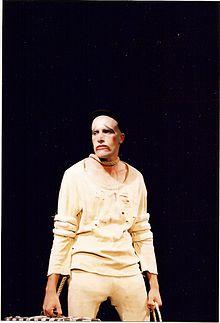 Lucky is unique in a play where most of the characters talk incessantly: he only utters two sentences, one of which is more than seven hundred words long (the monologue). Lucky suffers at the hands of Pozzo willingly and without hesitation. He is "tied" (a favourite theme in Godot) to Pozzo by a ridiculously long rope in the first act, and then a similarly ridiculous short rope in the second act. Both tie around his neck. When he is not serving Pozzo, he usually stands in one spot drooling, or sleeping if he stands there long enough. His props include a picnic basket, a coat, and a suitcase full of sand.