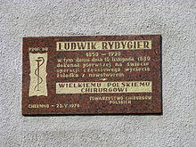 In 1899 in Lwów, Polish doctors celebrated the 25th anniversary of Ludwik Rydygier's scientific activity.[1] A monument of Ludwik Rydygier was unveiled in Chełmno in 1984.[2] Numerous hospitals in Poland are named after him, including in Kraków, Częstochowa,[1] Toruń, Łódź, Suwałki. Also the Collegium Medicum in Bydgoszcz and a lecture hall of the Medical University of Gdańsk bear his name.[1]