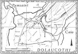 Luentinum appears to have been founded as a square 5½ acre (2.25 hectare) Roman auxiliary fort controlling the adjoining gold mines, around AD 75 when Frontinus was governor of Roman Britain and active in subduing the Silures of Roman Wales.[3] The fort had an earthen rampart and double ditch. The date of first construction was determined from a Samian ware inkwell with stamp in the early 1970s where the river bank had cut into the fort. On the east bank of the River Cothi, a few hundred yards south of Pumsaint village was discovered a small double-roomed building with hypocaust and plain tesselated floors. It was probably the military bath-house. The internal buildings of the fort underwent a number of rebuildings until the fort was abandoned around 140. The surrounding civilian vicus then took over the area and, no doubt, also the mines. The fort is situated about halfway between similar forts at Llandovery to the east and Bremia or Llanio to the west, with Llandeilo to the south.