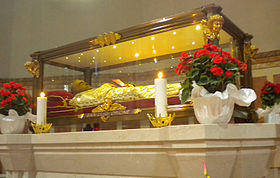 Orione's mortal remains have rested in the crypt of the Shrine of La Madonna della Guardia in Tortona, which he himself founded, since his burial on March 19, 1940[5] His body was later exhumed in 1965 for examination. On October 26, 1980, he was beatified by Pope John Paul II. Nearly 24 years later, he was canonized by that same pope, on May 16, 2004.[6]