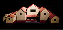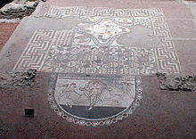 The dining room, or triclinium, was situated in the centre of the main building, and was highly decorated with a pair of large mosaics on the floor dating to the mid-4th century.[10] One depicts the abduction of the princess Europa by the god Jupiter who is disguised as a bull,[11] whilst the other depicts Bellerophon slaying the Chimera, whilst surrounded by four sea creatures. Surrounding these mosaics were smaller images depicting hearts, crosses and swastikas.