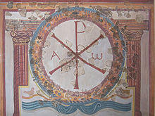 In the 4th century the room above the pagan shrine was apparently converted to Christian use, with painted plaster on the walls, including a row of figures of standing worshipers (orans), and a characteristic Christian Chi-rho symbol. Some of the paintings are now on display in the British Museum.[15]