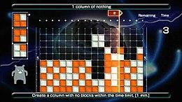 Lumines Live! is a puzzle game similar to its predecessor, Lumines: Puzzle Fusion. The objective of the game is to rotate, move, and drop colored blocks varying between to colors to form 2×2 squares of the same color. A vertical line known as the Time Line sweeps over the playing field and will erase the colored squares, granting points to the player's overall score. Deleting four or more squares will add a bonus multiplier to the player's overall score. Players lose the game when the blocks reach the top of the playing field.[1][2] Stages vary from thematic visual themes known as "Skins" that change the music, background, and sound effects.[1] There are seven game modes: Challenge mode, Puzzle, Time Attack, VS CPU, and Duel Mode. In Challenge mode, players are tasked to survive as long as possible and gain the highest possible score. Puzzle mode tasks players to use the blocks to create specific shapes. Time Attack mode tasks players to clear as many squares as possible within an allotted time.[3] Time Attack mode also allows players to share a recording of their best playthrough. In VS CPU mode, players share the playing field with an AI opponent and must defeat them by clearing more square than them, causing players to claim more of the playing field. In Duel Mode, players can compete with each other either locally or online. Unlike its predecessor, Lumines Live! also allows players to accumulate over one million points in a play session.[4]