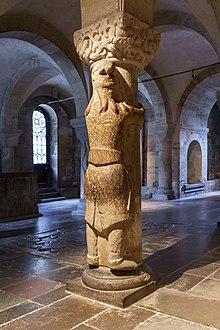 When it comes to stone sculpture, Lund Cathedral was the most lavishly decorated Romanesque building to be built in the Nordic countries, according to art historian Jan Svanberg,[80] and its sculptures are of recognised high artistic quality.[81] Perhaps the most well-known and striking of these are the sculptures of two figures traditionally called "The giant Finn and his wife" in the crypt.[82] According to a local legend, the giant helped build the cathedral, and when he was not paid for his services he tried to destroy it by shaking the pillars, but was petrified.[83] The larger of the two figures is embracing a column, while the smaller is attached to another column with a rope. These sculptures have probably been the subject of more attempts at an explanation than any other medieval artworks in Sweden, according to art historian Mereth Lindgren.[84] Most scholars today believe the larger sculpture depicts Samson, but what the smaller figure is supposed to represent is not known. The sculptures date from the construction of the crypt but have been treated poorly, especially during the 18th century, and lost much of their original detailing.[84]