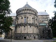 Seen from outside, the different elements of the building are clearly discernible as independent volumes, "as if they could be taken apart and put together again".[72] The apse of the cathedral is a "forcefully articulated" semi-circle.[30] Compared to its predecessors in Mainz, its composition is somewhat more elaborate with three distinct storeys each divided into fields, the lower by lesenes and the middle by columns with decorated capitals. The uppermost part is a gallery of shallow barrel vaults carried by 21 smaller columns, which open towards the exterior.[75] The apse is the most well-preserved part of the Romanesque building and has been described as "the artistic high point of the exterior".[76] The southern portal of the nave is perhaps the oldest of the cathedral. Five decorated archivolts supported by small columns with variously decorated capitals, frame a tympanon depicting the Lamb of God.[77] The northern portal is slightly later and more richly decorated. Its tympanon depicts Samson wrestling with the lion.[78] Two bronze doors built by Carl Johan Dyfverman serve as the main entrance in the centre of the west facade. They have 24 reliefs with subjects from the Bible, particularly the Old Testament. Above the doorway, the tympanon depicts Christ, Canute IV of Denmark and Saint Lawrence.[69] The cathedral has two sacristies.[3] The building material of the cathedral is mostly sandstone quarried in the area around Höör. The main walls are constructed as shells of sandstone filled with fieldstone mixed with lime mortar. The thickness of the walls is around 2 to 3 metres (6.6 to 9.8 ft).[3][79]
