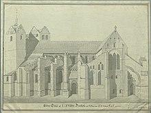When the congregation wanted to build a new church organ in the early 19th century, architect Axel Nyström was invited to examine the structure in 1832. Nyström recommended a complete renovation of the cathedral.[57] The chairman of the council in charge of administering the cathedral buildings, Carl Georg Brunius, was called to execute the plans of Nyström, and he did so while at the same time making changes according to his own convictions. He also wrote the first systematic art history of the cathedral.[58] Brunius had the organ moved, the crypt repaired, installed a set of steps connecting the choir with the nave and improved the drainage system.[58] He also removed modern furnishings, re-built some of the buttresses and changed the stone of a large part of the facade.[59] Brunius retired due to old age in 1859, but as there was still a substantial need for repairs, the young architect Helgo Zettervall was appointed to carry out the rest of the work in 1860.[60] A conflict between Brunius and Zettervall developed almost immediately, but Zettervall would keep working on restoring the cathedral until 1893 and ultimately managed to implement most of his ideas for the cathedral.[58][61] A compromise in 1862 proposed that the Danish architect Ferdinand Meldahl would assume the main responsibility, and Zettervall would merely assist Meldahl. However, it soon became apparent that Zettervall would not accept a subordinate role and Meldahl himself showed little interest in the project.[62] In 1862, Zettervall traveled extensively through Germany and Italy to study stylistically related architecture, and also to visit the latest examples of building restoration so that he could draw upon that experience in his work at Lund.[63] In 1863, he presented a first proposal for a complete restoration of the cathedral. Zettervall himself considered it a "reasonable middle ground between reparation and reconstruction".[64] The proposal would mean the removal of all buttresses, a new roof, completely rebuilt towers, and the removal of the large Gothic windows in the transepts. Zettervall also proposed to add an octagonal dome over the crossing. Far-reaching changes would also affect the interior. In the proposal Zettervall strove to reduce and refine the building volumes of the cathedral and create a unified composition of block-like elements.[65]