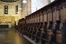 The choir contains two rows of medieval choir stalls containing in total 78 seats. The wooden stalls date from the end of the 14th century, probably commissioned by archbishop Nils Jönson some time between 1361 and 1379. Clearly made by several different wood carvers, they are approximately 3 metres (9.8 ft) tall without their gables and decorated with carved details. These are biblical scenes from both the Old and New Testament, but the stalls also contain misericords portraying animals and other small details. Their style is High Gothic and they are stylistically linked with contemporary art from the Rhine Valley. They are among the largest wooden Gothic sculptures to survive in the Nordic countries, and have been described as being of internationally high quality.[92] The choir stalls in Lund Cathedral also lent stylistic inspiration to the choir stalls in Roskilde Cathedral and St. Bendt's Church, Ringsted.[92][93]