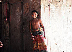 The Lungi (/luŋɡi/) or Tahband is a type of sarong that originated in the Indian subcontinent,[1] it can be described as an ethnic lower garment and a men's skirt that is wrapped around the lower waist, usually below the belly button. Apart from India, lungis are also worn in Sri Lanka (Ceylon), Bangladesh,& Nepal. It is also known as longyi in Singapore, Cambodia, Burma,& Thailand. The lungi is a particularly popular form of casual wear and night wear for men in regions where the heat and humidity of the climate make it unpleasant and uncomfortable to wear closed and tight garments such as trousers.[2]