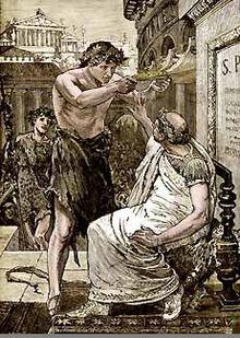 Descriptions of the Lupercalia festival of 44 BC attest to its continuity; Julius Caesar used it as the backdrop for his public refusal of a golden crown offered to him by Mark Antony.[18][19] The Lupercal cave was restored or rebuilt by Augustus, and has been speculated to be identical with a grotto discovered in 2007, 50 feet (15 m) below the remains of Augustus' residence; according to scholarly consensus, the grotto is a nymphaeum, not the Lupercal.[20] The Lupercalia festival is marked on a calendar of 354 alongside traditional and Christian festivals.[21] Despite the banning in 391 of all non-Christian cults and festivals, the Lupercalia was celebrated by the nominally Christian populace on a regular basis into the reign of the emperor Anastasius. Pope Gelasius I (494–96) claimed that only the "vile rabble" were involved in the festival[22] and sought its forceful abolition; the Senate protested that the Lupercalia was essential to Rome's safety and well-being. This prompted Gelasius' scornful suggestion that "If you assert that this rite has salutary force, celebrate it yourselves in the ancestral fashion; run nude yourselves that you may properly carry out the mockery".[23]