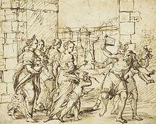 At the Lupercal altar, a male goat (or goats) and a dog were sacrificed by one or another of the Luperci, under the supervision of the Flamen dialis, Jupiter's chief priest.[12] An offering was also made of salted mealcakes, prepared by the Vestal Virgins.[13] After the blood sacrifice, two Luperci approached the altar. Their foreheads were anointed with blood from the sacrificial knife, then wiped clean with wool soaked in milk, after which they were expected to smile and/or laugh.