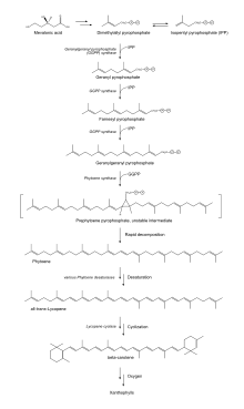 The unconditioned biosynthesis of lycopene in eukaryotic plants and in prokaryotic cyanobacteria is similar, as are the enzymes involved.[4] Synthesis begins with mevalonic acid, which is converted into dimethylallyl pyrophosphate. This is then condensed with three molecules of isopentenyl pyrophosphate (an isomer of dimethylallyl pyrophosphate), to give the 20-carbon geranylgeranyl pyrophosphate. Two molecules of this product are then condensed in a tail-to-tail configuration to give the 40-carbon phytoene, the first committed step in carotenoid biosynthesis. Through several desaturation steps, phytoene is converted into lycopene. The two terminal isoprene groups of lycopene can be cyclized to produce beta-carotene, which can then be transformed into a wide variety of xanthophylls.[4]