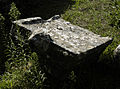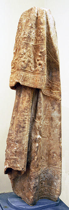 Although in many fragments and not completely preserved, the colossal cult group attributed to Damophon by Pausanias has been extensively studied and described.[7] No comprehensive study of all the remains has yet been carried out, however. The relatively small cella of the temple of Despoina was dominated by a cultic group of statues comprising four significantly greater than life-size acrolithic-technique figures as well as a highly ornate throne for the central figures of Despoina and Demeter - all in Pentelic marble.[16] This arrangement was somewhat unusual in that the typical situation was for there to be a single cult statue at the rear of the cella that was the primary object of veneration.[17] The central figures of Despoina and Demeter were on a colossal scale, significantly greater than that of Artemis and the Titan Anytus. The bust of Despoina is not preserved. Holes are preserved on the bust of Artemis for the attachment of earrings and other metal ornaments, and for a diadem (or rays) on the bust of Demeter. The eyes of Artemis and Anytus were inset, rather than being carved from the marble as they were in the bust of Demeter. The great goddess, Gaia, could be represented as a throne and the throne of Despoina and Demeter was decorated with tritonesses - an appropriate theme given the identification of Poseidon as the father of Despoina. This nautical reference is underscored by the presence of marine themes on the veil of Despoina as well. One of these tritonesses was replaced in the Roman period, indicating damage to the group, perhaps due to an earthquake.