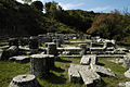 The Temple of Despoina is prostyle-hexastyle in plan and in the Doric order - i.e. it had six Doric columns across the front façade only. In plan, the stylobate (platform) of the temple measures 11.15 by 21.35 m and is divided between a pronaos (front portico) and a cella.[9] The lower portion of the walls of the temple cella are built of limestone, consisting of a course of orthostates capped by two string courses; the walls are completed to the level of the roof in fired clay brick, which would have been plastered. The six columns of the façade are in marble, as is the entablature. A curious feature of this temple is the doorway in the south wall facing the theater-like area. Although uncommon, side doorways are known from other temples in Arkadia: i.e. Athena Alea at Tegea, and Apollo Epikourios at Bassai.