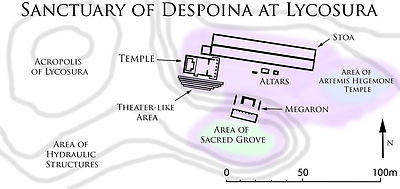 The site of Lycosura occupies a hill of 632 m in the wooded, mountainous region south of the river Plataniston. The Sanctuary of Despoina is sited in a declivity on the north-eastern face of the hill occupied by the city. The temple and considerable remains of the cult statuary group were discovered in 1889 CE by the Greek Archaeological Service, well before the advent of stratographic excavation techniques. Dating of the finds and structures thus remains problematic, although later excavations and studies have attempted to clarify the situation. While the site of the city remains largely unexcavated, the sanctuary of Despoina has been uncovered thoroughly and consists of a temple, a stoa, an area of theater-like seats, three altars, and an enigmatic structure conventionally called the Megaron. Pausanias also describes a temple of Artemis Hegemone (Artemis the Leader) at the entrance to the sanctuary on its eastern side;[10] to date, this structure and a number of others mentioned by the author have not been identified archaeologically. Traces of the temenos wall (boundary of the sacred area) have been detected on the north and the east sides of the sanctuary; thus, the southern and western limits of the sacred area are unknown.
