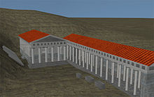 To the northeast of the temple, there was a Stoa also in the Doric order with a single story and an internal colonnade, measuring 14 by 64 m. Foundations for a room of uncertain function measuring 5.5 by 6 m are connected to the west end of the stoa. Pausanias reported that the stoa contained a panel painted with matters pertaining to the mysteries and four bas-relief sculptures in white marble depicting:[12]