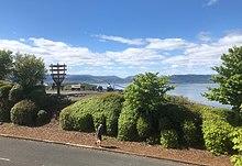 A war memorial to the Free French forces who fought in the Second World War stands on the western brow of the hill. The Free French Memorial, Greenock, was built in the shape of the Cross of Lorraine, the emblem of the Free French, combined with an anchor. It has plaques commemorating the loss of the Flower-class corvettes Alyssa and Mimosa, and of the submarine Surcouf.[2] Locally, it is also associated with the memory of the loss of the Maillé Brézé which blew up at the Tail of the Bank.[36][37]