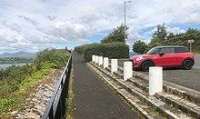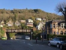 From 1863 onwards, the Caledonian Railway and the Greenock and Ayrshire Railway sought approval for rival schemes taking various routes for a connection to Gourock. In 1883 the House of Lords committee decided in favour of a Caledonian Railway scheme, and their railway opened in 1889.[22] It runs in a bored tunnel directly under Newton Street, the next street to the south parallel with Finnart Street, diverging where Newton Street bends west into Lyle Road. Houses eventually developed along Newton Street a short distance past this bend: the length of Lyle Road from these houses to the junction with Eldon Street is approximately 1.5 miles (2.4 km). The railway tunnel ends in the Fort Matilda area, and a short distance to the west of Fort Matilda station an iron railway bridge takes the line over Lyle Road, on its way to Gourock station and pierhead.[23]