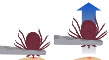 Attached ticks should be removed promptly. Risk of infection increases with time of attachment, but in North America risk of Lyme disease is small if the tick is removed within 36 hours.[139] CDC recommends inserting a fine-tipped tweezer between the skin and the tick, grasping very firmly, and pulling the closed tweezer straight away from the skin without twisting, jerking, squeezing or crushing the tick.[140] After tick removal, any tick parts remaining in the skin should be removed with the tweezer, if possible.[140] Wound and hands should then be cleaned with alcohol or soap and water.[140] The tick may be disposed by placing it in a container with alcohol, sealed bag, tape or flushed down the toilet.[140] The bitten person should write down where and when the bite happened so that this can be informed to a doctor if the person gets a rash or flu-like symptoms in the following several weeks.[140] CDC recommends not using fingers, nail polish, petroleum jelly or heat on the tick to try to remove it.[140]