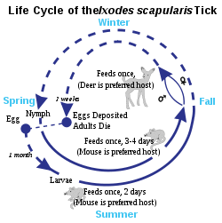 Lyme disease is classified as a zoonosis, as it is transmitted to humans from a natural reservoir among small mammals and birds by ticks that feed on both sets of hosts.[52] Hard-bodied ticks of the genus Ixodes are the main vectors of Lyme disease (also the vector for Babesia).[53] Most infections are caused by ticks in the nymphal stage, because they are very small and thus may feed for long periods of time undetected.[52] Nymphal ticks are generally the size of a poppy seed and sometimes with a dark head and a translucent body.[54] Or, the nymphal ticks can be darker.[55] (The younger larval ticks are very rarely infected.[56]) Although deer are the preferred hosts of adult deer ticks, and tick populations are much lower in the absence of deer, ticks generally do not acquire Borrelia from deer, instead they obtain them from infected small mammals such as the white-footed mouse, and occasionally birds.[57] Areas where Lyme is common are expanding.[58]