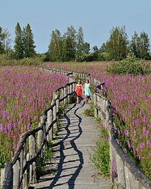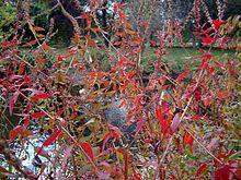 The purple loosestrife has been introduced into temperate New Zealand and North America where it is now widely naturalised and officially listed in some controlling agents. Infestations result in dramatic disruption in water flow in rivers and canals, and a sharp decline in biological diversity as native food and cover plant species, notably cattails, are completely crowded out, and the life cycles of organisms from waterfowl to amphibians to algae are affected. A single plant may produce up to 2.7 million tiny seeds annually.[15] Easily carried by wind and water, the seeds germinate in moist soils after overwintering. The plant can also sprout anew from pieces of root left in the soil or water. Once established, loosestrife stands are difficult and costly to remove by mechanical and chemical means.