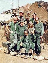 The cast of M*A*S*H from Season 6, 1977 (clockwise from left): William Christopher, Gary Burghoff, David Ogden Stiers, Jamie Farr, Mike Farrell, Alan Alda, Harry Morgan, Loretta Swit.