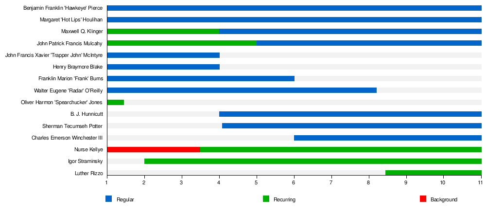 | Maxwell Q. Klinger (Recurring seasons 1–3, regular 4–11) | Jamie Farr | Corporal, later Sergeant | Corpsman, later Company Clerk | 217 |