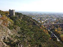 Wiener Neudorf to the east, and Maria Enzersdorf to the north, merge directly into Mödling. South of Mödling is Gumpoldskirchen, separated by the Eichkogel with its very special flora. In the west a narrow street runs through Vorderbrühl, formally a village in its own rights, and leads to Hinterbrühl. This narrow valley is called Klausen, above it the remains of the Mödling castle, once belonging to the Babenberger, the then ruling family. On the other side of the Klausen is the Kalenderberg, with the castle of Liechtenstein on its far side. The beginning of the Klausen is marked by the large red-brick aqueduct of the Erste Wiener Hochquellenwasserleitung. The steep, rocky valley sides of the Naturpark Föhrenberge grow the typical Wienerwald-Schwarzföhren (the austriaca form of the European Black Pine, Pinus nigra).