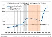 Development of population since 1875 within the current Boundaries (Blue Line: Population; Dotted Line: Comparison to Population development in Brandenburg state; Grey Background: Time of Nazi Germany; Red Background: Time of communist East Germany)