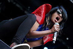 Contrary to her present style, M.I.A.'s Arular era style has been described as "tattered hand me downs and patched T-shirts of indigents", embodying the "uniform of the refugee" but modified with cuts, alterations and colours to fashion a distinctly new style and apparel line.[218] M.I.A. built on this during the Kala era with a "playful" combination of baggy T-shirts, leggings and short-shorts. She incorporated eccentric accessories in bold patterns, sparkle and "over-saturated" neon colour to fashion her signature style which inspired flocks of "garishly-clothed all-too-sassy" new-rave girls with bright red tights, cheetah-skin smock and faded 1980s T- shirts. Her commodifying and performance of this refugee image has been noted to "reposition" perceptions of it in the wider public. Hailed as presenting a challenge to the mainstream with her ironic style, M.I.A. has been praised for dictating such a subcultural trend worldwide, combining "adolescent" frustrations of race and class with a strong desire to dance.[219] Eddy Lawrence of Time Out commented how her multi genre style contributed to her being beloved of the broadsheet fashionistas yet simultaneously patron saint and pin-up for the Day-Glo nu-rave kids.[220] Similarly, Mary Beth Ray, in the book Rock Brands: Selling Sound in a Media Saturated Culture writes that M.I.A.'s hybrid style addressed a number of social and political issues including power, violence, identity and survival in a globalised world, while using avenues that challenged "traditional" definitions of what it meant to be a contemporary pop artist.[221]