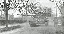The M18 Hellcat was a key element during World War II in the Battle of the Bulge.[28] On December 19–20, Team Desobry, a battalion-sized tank-infantry task force of the 10th Armored Division was assigned to defend Noville located north-northeast of both Foy and of Bastogne, just 4.36 mi (7.02 km) away. With just four[29] M18 tank destroyers of the 705th Tank Destroyer Battalion to assist, the paratroopers of 1st Battalion of the 506th Parachute Infantry Regiment attacked units of the 2nd Panzer Division, whose mission was to proceed by secondary roads via Monaville (just northwest of Bastogne) to seize a key highway and capture, among other objectives, fuel dumps—for the lack of which the overall German counter-offensive faltered and failed. Worried about the threat to its left flank in Bastogne, it organized a major joint arms attack to seize Noville. Team Desobry's high-speed highway journey to reach the blocking position is one of the few documented cases[29] in which the top speed of the M18 Hellcat – 50 mph (80 km/h) – was actually used to get ahead of an enemy force.[29]
