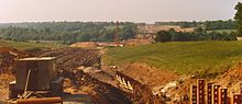 There was no individual public inquiry into the M25 as a whole.[34] Each section was presented to planning authorities in its own right and was individually justified, with 39 separate public inquiries relating to sections of the route. The need for the ministry to negotiate with local councils meant that more junctions with local traffic were built than originally proposed.[35] A report in 1981 showed that the M25 had the potential to attract office and retail development along its route, negating the proposed traffic improvements and making Central London a less desirable place to work.[36] None of the motorway was prevented from being built by objections at the public inquiries.[37] However, as a consequence of the backlash against the Ringways, and criticism at the public inquiries, the motorway was built with environmental concerns in mind. New features included additional earth mounds, cuttings and fences that reduced noise, and over two million trees and shrubs to hide the view of the road.[38]