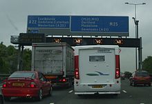 Since 1995, sections of the M25 have been equipped with variable speed limits. These purposefully slow traffic down in the event of congestion or an obstruction and help manage the traffic flow.[90] The scheme was originally trialled between Junctions 10 and 16, and was made a permanent fixture in 1997.[91]