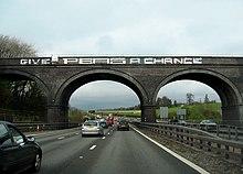 Iain Sinclair's 2002 book and film London Orbital is based on a year-long journey around the M25 on foot.[120] A piece of graffiti on the Chalfont Viaduct, clearly visible from the M25 and reading "give peas a chance" (parodying John Lennon's "Give Peace A Chance") became popular with the public, attracting its own Facebook group.[121][122] The message originally read "Peas", supposedly the tag of a London graffiti artist; the rest of the wording is reported to have referred to his frequent clashes with the law.[123][124] In September 2018, after almost 20 years, the graffiti was vandalised and then removed and replaced with the message "give Helch a break".[125] A spokesman for Network Rail sympathised with the requests to restore the "much-loved graffiti", but said they do not condone people putting their lives at risk by trespassing.[125][126]