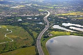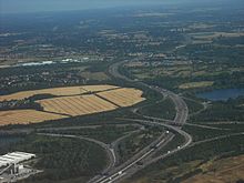 To the west, the M25 passes close to the edge of Heathrow, and within sight of Windsor Castle.[13] North of this, it crosses the Chiltern Main Line under the Chalfont Viaduct, a 19th-century railway bridge. Red kites can often be seen overhead to the north of this, up to Junction 21. The northern section of the M25 passes close to All Saints Pastoral Centre near London Colney, Waltham Abbey and Copped Hall.[10][11] This section also features two cut-and-cover tunnels, including the Bell Common Tunnel.[11] The north-eastern section of the motorway passes close to North Ockendon, the only settlement of Greater London situated outside the M25.[14] It then runs close to the Rainham Marshes Nature Reserve before reaching the northern end of the Dartford Crossing.[10]