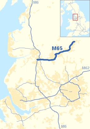 The M65 is a motorway in Lancashire, England. It runs from just south of Preston through the major junction of the M6 and M61 motorways, east past Darwen, Blackburn, Accrington, Burnley, Brierfield, Nelson and ends at Colne.