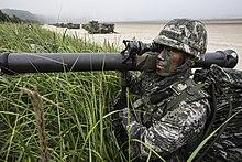 Adopted in 1959 in Army service, the M67 was used in the Vietnam War together with the much larger 105 mm M40.[3] The M67 proved an effective weapon, though it was primarily used against personnel in combat, and saw little or no use against armor and even against fortifications.[4] While troops praised its effectiveness, the M67 came under heavy criticism due to the weapon's weight and length as well as its backblast, which often precluded its use in offensive operations.[4] Because of these disadvantages, the Marine Corps units continued to use the old M20 Super Bazooka in preference to the M67.[5] It was largely replaced in Army service by the M47 Dragon anti-tank missile system starting in 1975.[4] The M67 was also issued to anti-armour platoons of 1 ATF (Australian/New Zealand Task Force) during the Vietnam war, being used near the perimeter of the defense bases due to its weight.[6] The M67 was issued in lieu of the standard issue Carl Gustav for these armies. This may have been to simplify logistics, or it may be that ammunition for the Carl Gustav could not be sourced due to Swedish opposition to the war in Vietnam.