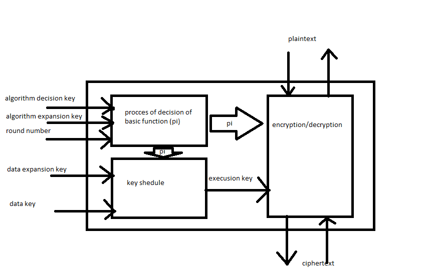 After decision process, which is using round number, decision and expansion keys, the algorithm gets basic function (e π) or (d π). Then it is used either by key scheduler (which also takes 256 key expansion key and 64 bits data key), that products 256 bits execution key, and encryption/decryption block.