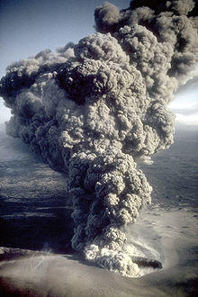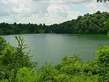 A maar is a broad, low-relief volcanic crater caused by a phreatomagmatic eruption (an explosion which occurs when groundwater comes into contact with hot lava or magma). A maar characteristically fills with water to form a relatively shallow crater lake which may also be called a maar.[1] The name comes from a Moselle Franconian dialect word used for the circular lakes of the Daun area of Germany.[2]