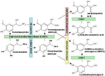- Adrenaline or noradrenaline to 3,4-Dihydroxymandelic acid