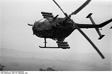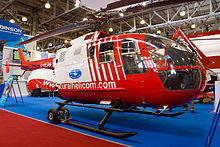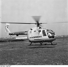 The Messerschmitt-Bölkow-Blohm Bo 105 is a light, twin-engine, multi-purpose helicopter developed by Bölkow of Ottobrunn, West Germany. It was the first light twin-engine helicopter in the world, and the first rotorcraft that could perform aerobatic maneuvers such as inverted loops.[3][4] The Bo 105 features a revolutionary hingeless rotor system, at that time a pioneering innovation in helicopters when it was introduced into service in 1970. Production of the Bo 105 began at the then-recently merged Messerschmitt-Bölkow-Blohm (MBB).