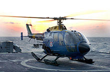 The Mexican Navy operated a number of armed Bo 105s to perform maritime reconnaissance duties; during the early 1980s, Mexico procured a number of a Uribe-class patrol vessels which were equipped to handle the Bo 105 for off-shore operations.[30] In 2005, work was completed on a series of upgrades to 11 of the Mexican Navy's Bo 105s, having received Forward looking infrared (FLIR) sensors, Global Positioning System (GPS) receivers, search radars, new rotor blades, armament pylons, and other changes.[31] In November 2014, Jet Rescue Air Ambulance inaugurated Mexico's first dedicated civil air ambulance rotorcraft using a Bo 105.[32]