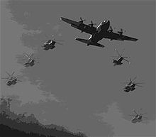 Talons supported Operation Just Cause, the United States invasion of Panama in December 1989 and January 1990.[26] Three MC-130Es of the 1st Special Operations Wing deployed to Hunter Army Air Field, Georgia within 48 hours of being alerted, then airlanded Rangers of the 2nd Battalion 75th Ranger Regiment into Rio Hato Military Airfield on December 18, 1989. The operation was conducted under total blackout conditions, using night vision goggles, 35 minutes after the opening parachute assault. One of the MC-130s had an engine disabled by a ground obstruction while taxiing, then made an NVG takeoff on three engines under intense ground fire, earning its pilot the Distinguished Flying Cross. The lead Talon, the only MC-130E equipped with the Benson tank refueling system, remained on the airfield as a Forward Area Refueling and Rearming Point (FARRP) for U.S. Army OH-6 helicopters.[60] When Panamanian General Manuel Noriega surrendered on January 3, he was immediately flown to Homestead Air Force Base, Florida, by a Combat Talon.[61]
