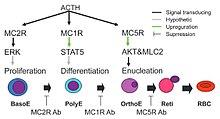 - ^ Simamura E, Arikawa T, Ikeda T, Shimada H, Shoji H, Masuta H, Nakajima Y, Otani H, Yonekura H, Hatta T (2015). "Melanocortins contribute to sequential differentiation and enucleation of human erythroblasts via melanocortin receptors 1, 2 and 5". PLOS ONE. 10 (4): e0123232. Bibcode:2015PLoSO..1023232S. doi:10.1371/journal.pone.0123232. PMC 4393082. PMID 25860801.