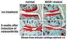- ^ Lorenz J, Seebach E, Hackmayer G, Greth C, Bauer RJ, Kleinschmidt K, Bettenworth D, Böhm M, Grifka J, Grässel S (2014). "Melanocortin 1 receptor-signaling deficiency results in an articular cartilage phenotype and accelerates pathogenesis of surgically induced murine osteoarthritis". PLOS ONE. 9 (9): e105858. Bibcode:2014PLoSO...9j5858L. doi:10.1371/journal.pone.0105858. PMC 4156302. PMID 25191747.