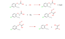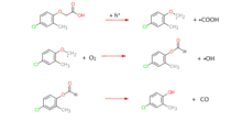 MCPA also could be photochemically degraded. Two scheme pathways can be proposed for the formation of the main intermediate, MCP. One scheme is MCPA oxidation by hydroxyl radical, •OH. The hydroxyl radical adds on the ring, followed by radical transfer to the ether carbon. With oxygen present, the addition of the hydroxyl radical leads the cleavage of the ether link, yielding MCP. The other scheme is MCPA oxidation by positive electron holes h+. The positive holes h+ polarize carboxyl group, CH2-COOH bond is split to produce 4-chloro-2-methylphenylformate. With the presence of oxygen, the positive holes h+ oxidation finally yields MCP as well.[21]