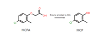 The MCPA can be degraded biologically in soils by plants and microorganisms. The major metabolite of MCPA degradation is MCP (4-chloro-2-methylphenol). The pathway could be the cleavage of the ether linkage, yielding MCP and acetate acid. Another pathway could be the hydroxylation of the methyl group, yielding cloxyfonac (4-Chloro-2-hydroxymethylphenoxyacetic acid). Recent studies have demonstrated that biological degradation of MCPA is enzymatically catalyzed by an α-ketoglutarate-dependent dioxygenase encoded by the tfdA gene of soil microorganisms. Soil indigenous bacteria that carry the tfdA gene could use MCPA as the sole source of carbon.[22][23]