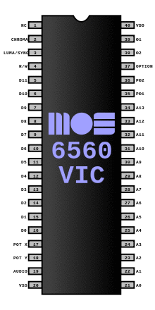 The VIC (Video Interface Chip), specifically known as the MOS Technology 6560 (NTSC version) / 6561 (PAL version), is the integrated circuit chip responsible for generating video graphics and sound in the Commodore VIC-20 home computer. It was originally designed for applications such as low cost CRT terminals, biomedical monitors, control system displays and arcade or home video game consoles.
