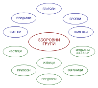 Words, even though they represent separate linguistic units, are linked together according to the characteristics they possess. Therefore, the words in Macedonian can be grouped into various groups depending on the criteria that is taken into consideration. Macedonian words can be grouped according to the meaning they express, their form and their function in the sentence. As a result of that, there are three types of classification of the Macedonian words: semantic, morphological and syntactic classification.[3]